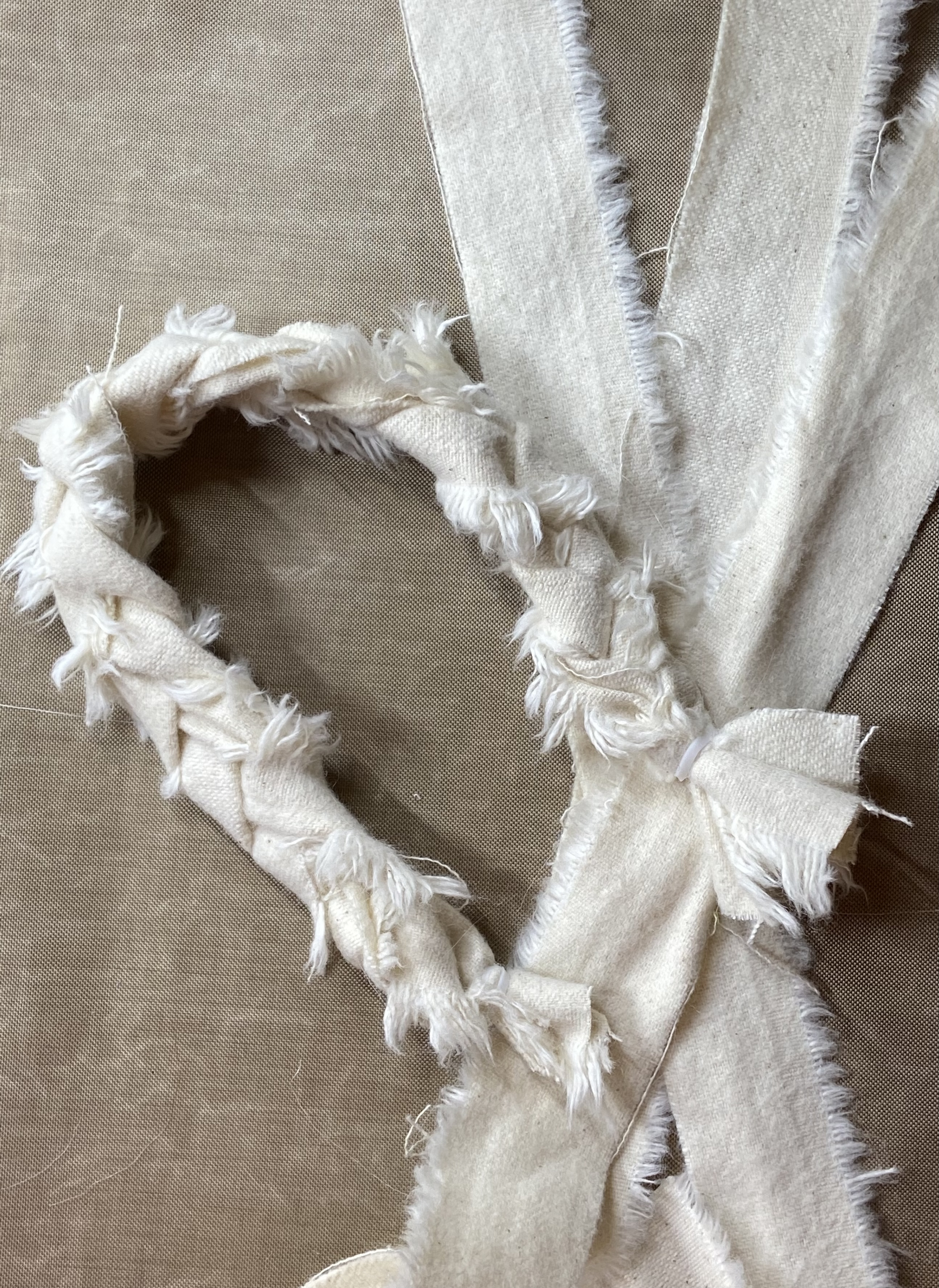 Optional: Braids for the girl Gnome. I used 1 in wide strips of soft eggshell cotton muslin fabric. I got it from our local re-use store. It looks like someone cut the salvage off of fabric. It worked perfect with the little fringe on the edge it adds to the look of hair in the braids. You can use anything yarn, strips of other fabric or even the strings from a cotton mop. You can make them as thick as you want as well and any color you want. I started with strips 1 inch x 20 inches and braided a fairly loose braid using rubber bands on the ends to secure the braid. The end result was about 10 inches in length. I then trimmed the ends below the rubber bands to my desired length and so they would be even with each other. For the girl Gnome, skip the steps for the beard. =) To attach her hair I just hot glued it across the top of her head either in front or behind the “topknot”. Decorate with ribbon/string/jute on the ends.