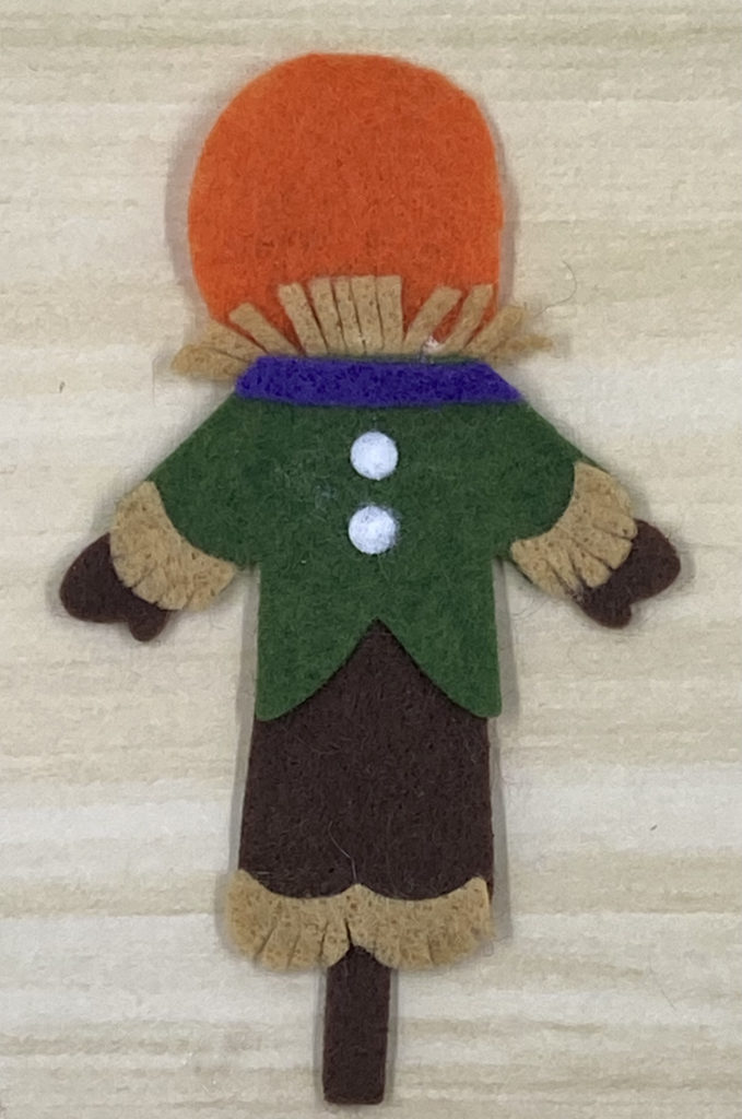 Start with his head. You will need to fringe both of the “Kings Hat” pieces. To do this cut small slits about 3/4 of the way into the piece along the long side. This will naturally flair out from the more narrow opposite side. Be careful not to cut the slits too close together or the felt might tear and the piece will fall off. I have shown the back of his head and hat so you can see the placement of the fringe. On the hat the fringe should come from underneath the hat and on his head it should be on top reaching up onto his face. You can see this is the second picture. When they are glued together they will look like the third picture.